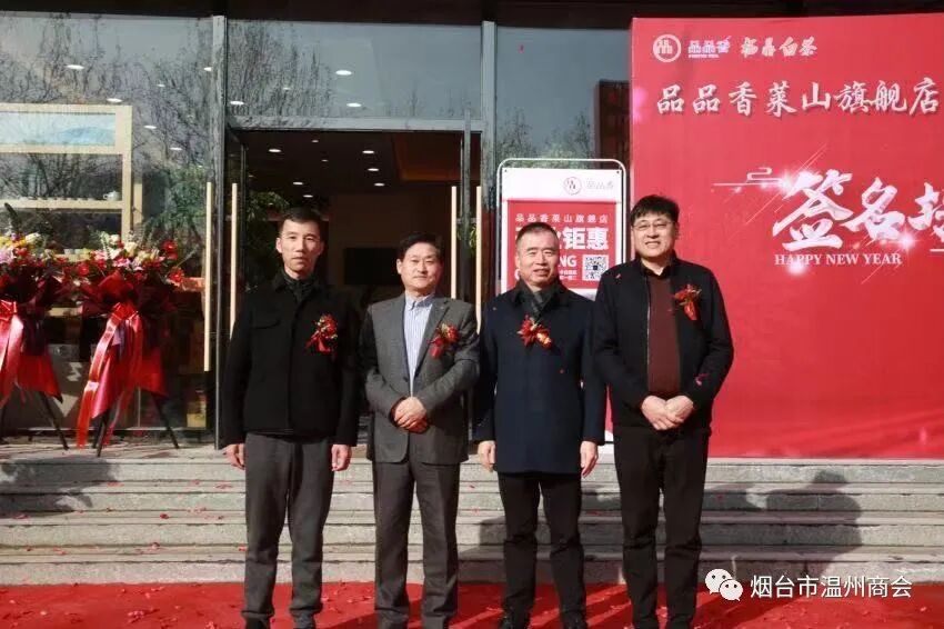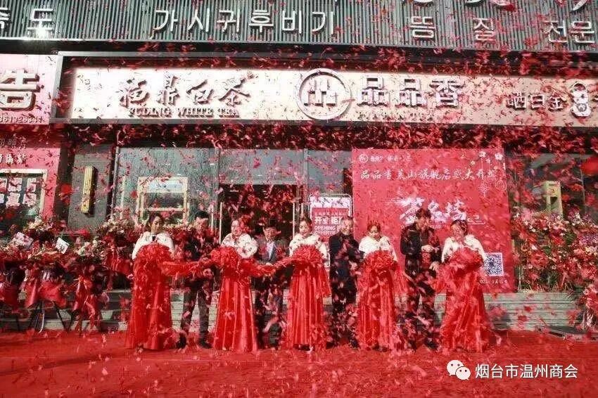 最后,由烟台市温州商会会长陈光晓、烟台市潍坊商会常务副会长张金光、品品香白茶旗舰店总经理吴越、品品香白茶烟台总经销总经理宋浩为旗舰店开业剪彩。